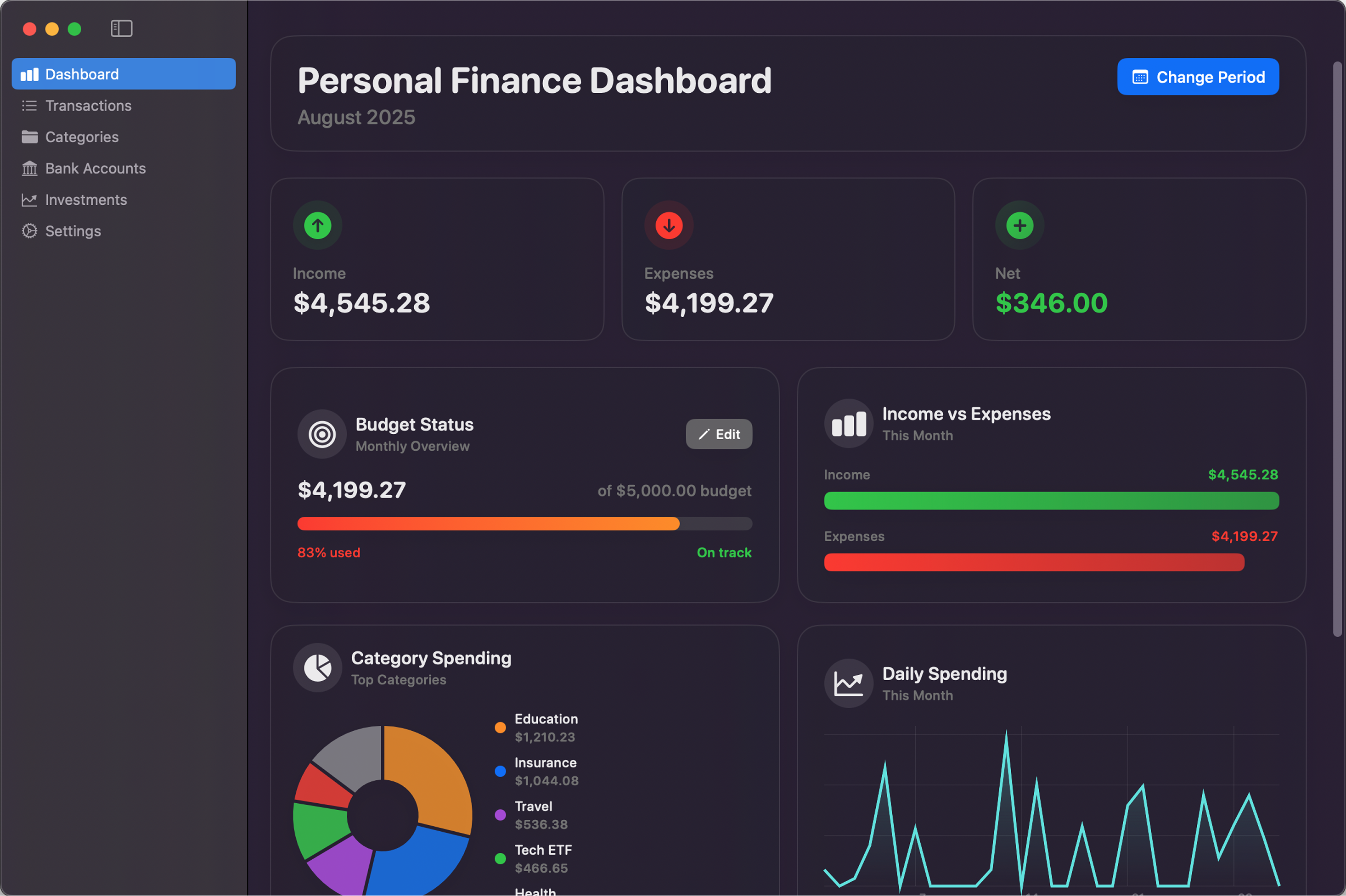 Toggle dedicated investment tracking with separate categories and portfolio analysis.