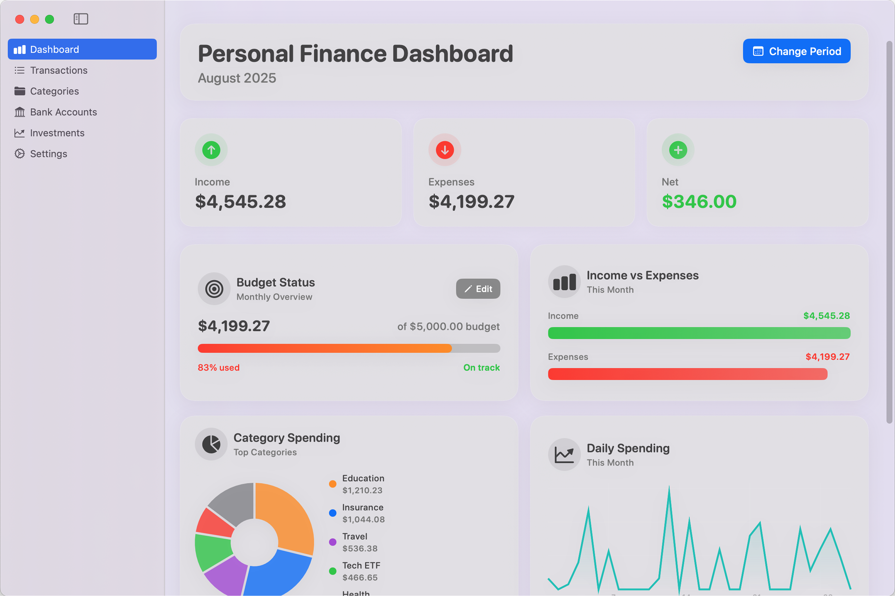 Set monthly budgets for categories and track your spending progress with visual indicators.